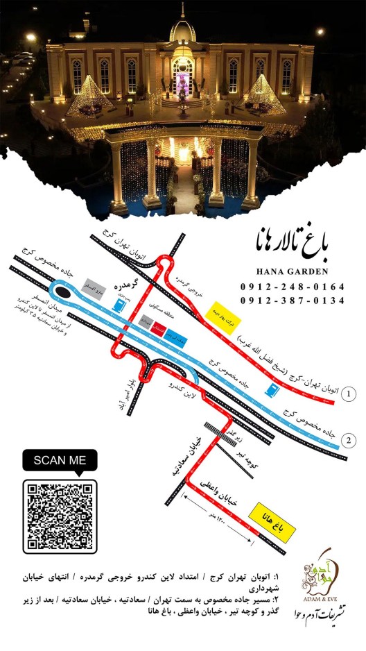 اتوبان تهران کرج / امتداد لاین کندرو خروجی گرمدره / انتهای خیابان شهرداری / جاده مخصوص به سمت تهران / خیابان سعادتیه / بعد از زیر گذر / خیابان واظی / باغ هانا